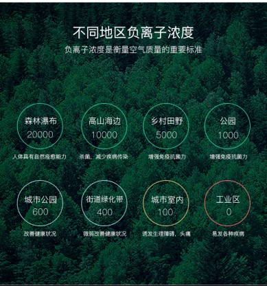 在鄉(xiāng)下、森林、瀑布或海邊等野外環(huán)境中,我們呼吸感到格外心曠神怡,原因是空氣中含有大量負(fù)氧離子。負(fù)氧離子,顧名思義就是帶負(fù)電荷的氧氣離子,在自然界中空氣的負(fù)氧離子是在紫外線、宇宙射線、放射性物質(zhì)、雷電、風(fēng)暴、瀑布、海浪沖擊下產(chǎn)生的。